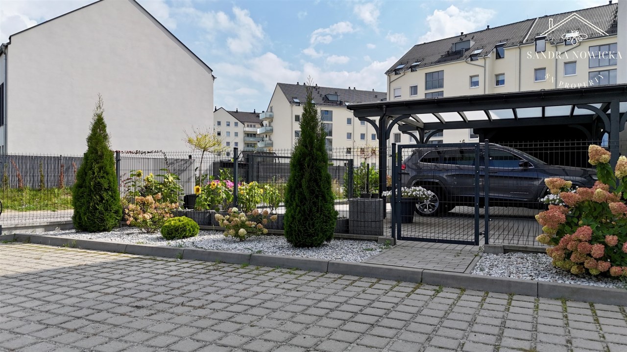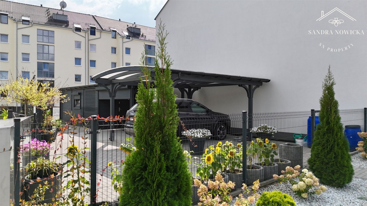 przynależny ogródek o powierzchni 135 m2 z wiatą na samochód, domkiem narzędziowym, oraz miejscem na wypoczynek,